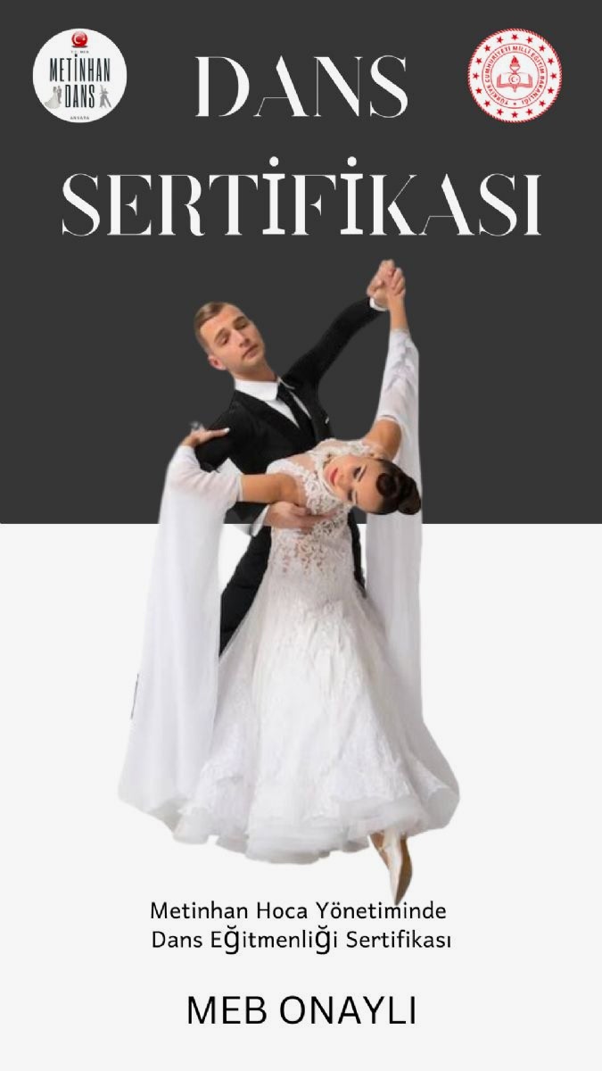 MEB Onaylı Dans Sertifikası Bu sertifika, dans eğitmeni olmayı hedefleyenler için oldukça önemli bir belgedir ve dans eğitimi vermek için gereken resmi yetkiyi sağlar. Sertifika, Milli Eğitim Bakanlığı (MEB) tarafından onaylandığı için geçerliliği Türkiye'de aynı zamanda Tüm Dünya ülklerinde ilgili kurumlarda geçerli ve kullanım alanı oldukça geniştir. Rresmi dans eğitimi vermek isteyenler için gerekli bir belgedir.