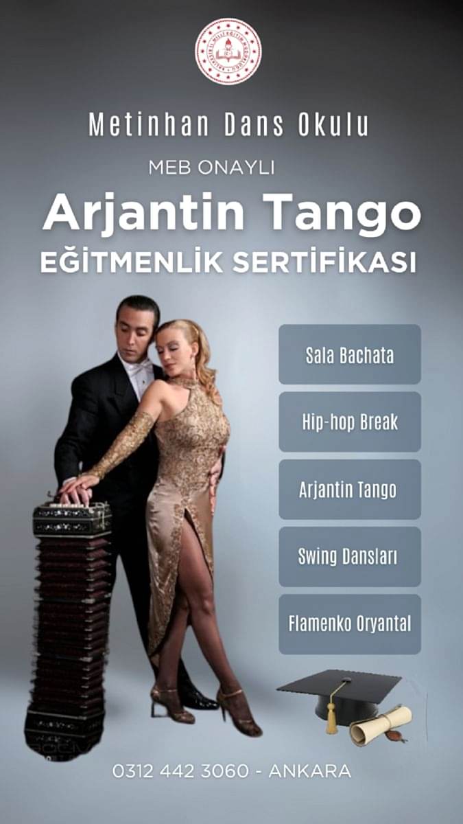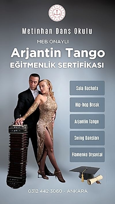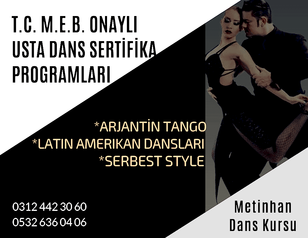 ÖNEMLİ NOT : İnternette Dans Sertifika Verdiğini İddia Eden Üniversite Onaylı ve Benzer Online İşletmelere İtibar Etmeyiniz. T.C. MEB ve T.C. Gençlik Spor Bakanlığı Onaylı Olmayan Hiçbir Sertifikanın Geçerliliği Yoktur. Bu Sertifikaların Geçerliliğini Bulunduğunuz İl ve İlçe Milli Eğitim Müdürlüğü ve Gençlik Spor Bakanlığı İl Müdürlüklerine Sorunuz. Ayrca Online Tango Sosyal Latin ve Serbest Stil alınında Dans Eğitmenlik Kursu Veriyoruz diye Spornsorlu Reklam Veren Kişi ve Kurslara İtibar Etmeyiniz... Bu Şahısların Sadece Eğitim Verdiklerini Dans Sertifikası Vermediğini Bilmenizde Fayda Vardır. Bu Şehir Kurnazlarına Karşı Dikkatli Olmanızı Öneririz. Bu Şahısları Bulunduğunuz İl ve İlçe MEB'den Sertifika Verip Vermediğini Sorunuz ve Bu Sorularınız Dolaylı Olarak MEB'e Şikayet Etmiş Olursunuz. Zaten Dans Sertifikası Veren Kurslar Almak İstediğiniz Dans Sertifikasının Eğitimini Vermektedir. Ayrıca Resmi Devlet Kurumlarının Onaylamadığı Hiçbir Sertifikanın Geçerliliği Yoktur. MEB Onaylı Dans Sertifkası Almak İçin Yeni Başlayanlara Kendi Kursumuzda 8 Aylık Programa Tabi Tutuyoruz Şayet Daha Önce Dans Etmiş ve Hala Devam Ediyorsa veya Dans Eğitmenliği Yapmış yada Halen Dans Eğitmeni ise 1 Aylık Uygulama ve Teknik Destek Program Sonunda Sertifkasını Almaya Hak Kazanır... MEB Onaylı Kurs Bitirme yani Dans Eğitmenliği Sertifikası Aynı Zamanda Tüm Dünyada İlgili Kurumlarda Geçerlidir. Yani Uluslararası Geçerli Diploma Niteliğinde Bir Sertifikadır.
