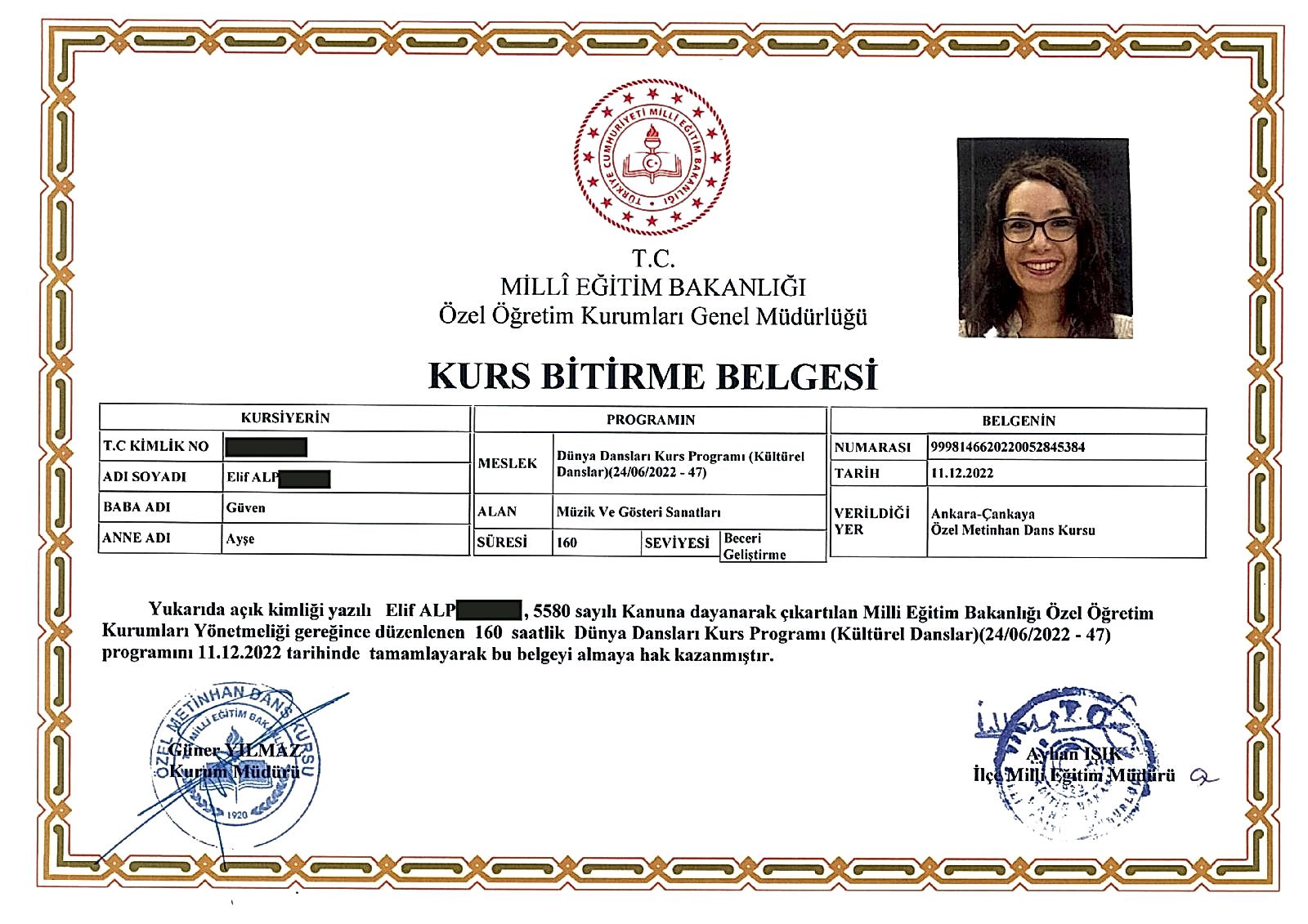 ÖZEL METİNHAN DANS KURUMUMUZ (KURSUMUZ) TARAFINDAN VERİLEN DANS SERTİFİKASI